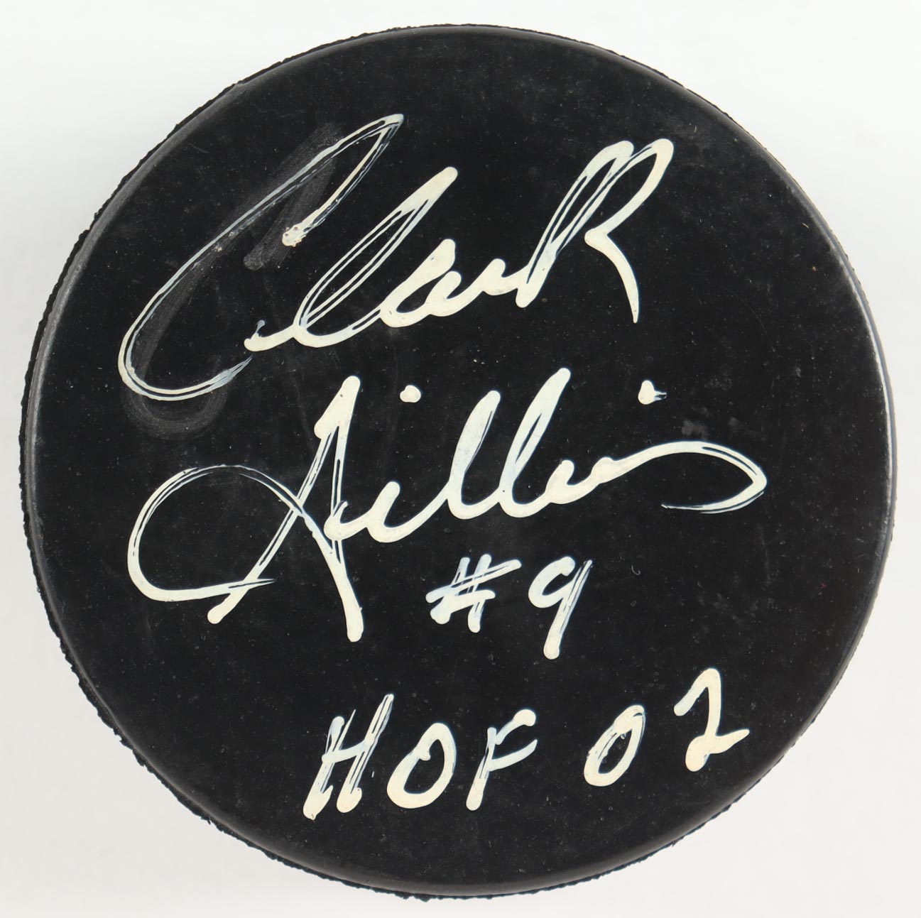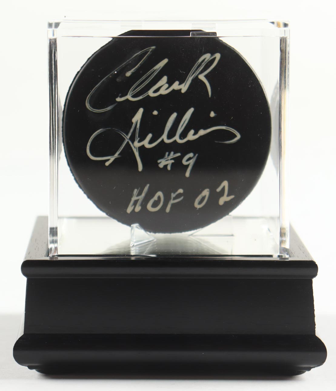 Clark Gilles Signed NHL Puck In Display Case Inscribed "HOF 02" (PSA)