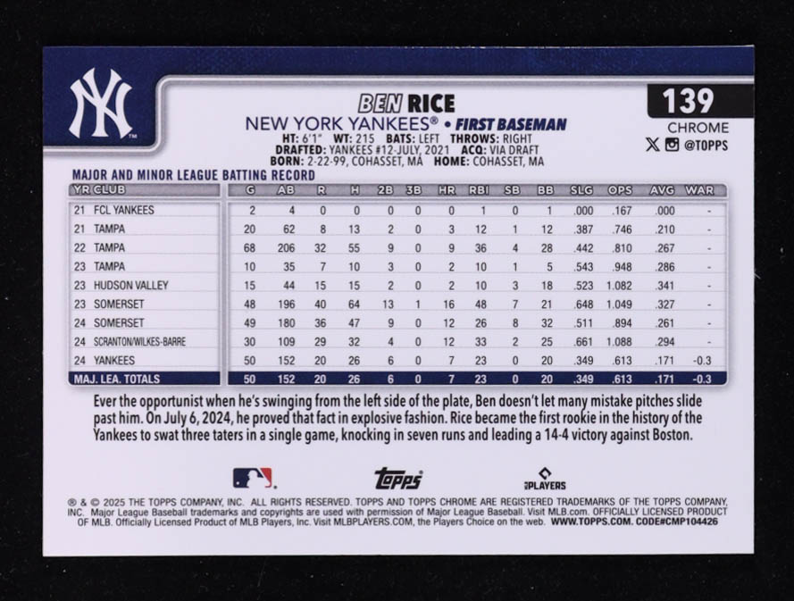 Ben Rice 2025 Topps Chrome Prism Refractors #139 RC
