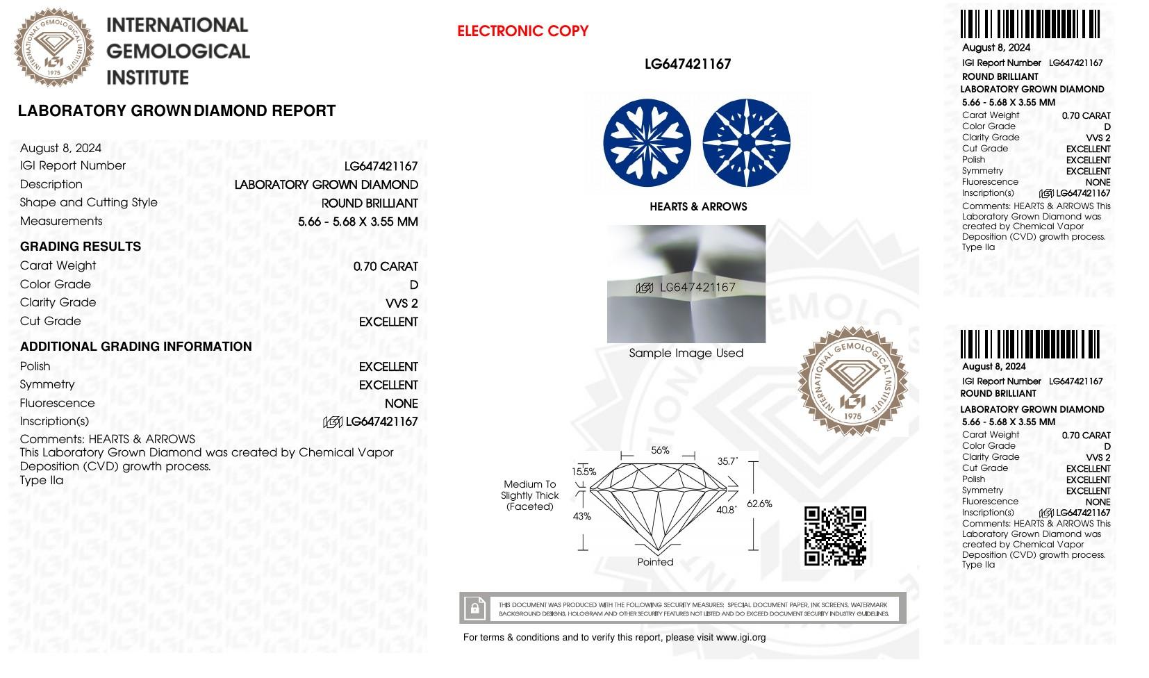 .70 Carats Lab Grown Diamond Loose D, VVS2 | Hearts & Arrow Round Cut | (IGI Cert)