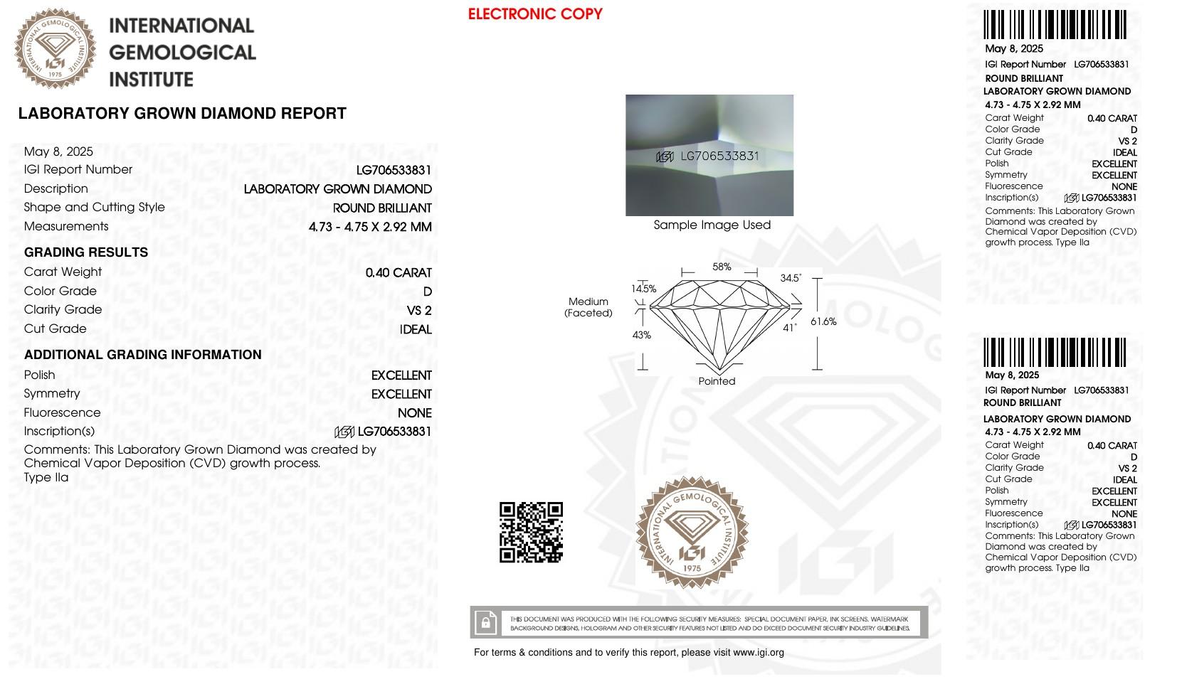 One (1) Round Brilliant Ideal Cut Laboratory Grown Diamond