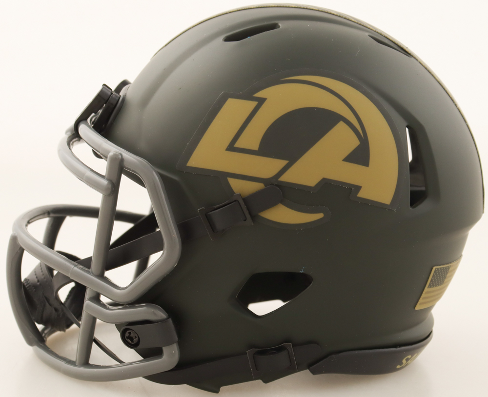 Riddell Los Angeles Rams Salute To Service Alternate Speed Mini Helmet has been hand-signed by Aaron Donald.