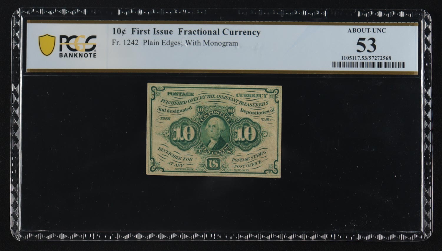 First Issue 10 Cents Fractional Currency Note Plain Edges / with Monogram (PCGS Banknote About Unc 53)