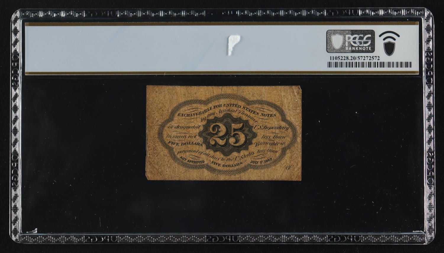 First Issue 25 Cents Fractional Currency Note Plain Edges / with Monogram (PCGS Banknote Very Fine 20)