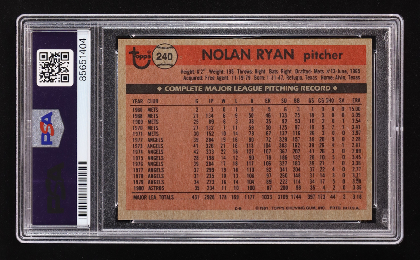 Nolan Ryan Signed 1981 Topps Inscribed "324 Wins, 5,714 Ks" #240 (PSA | Autograph Graded PSA 10)