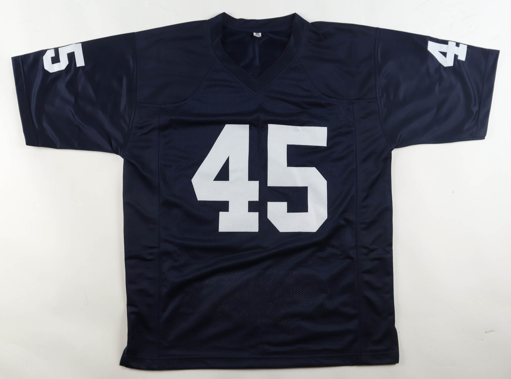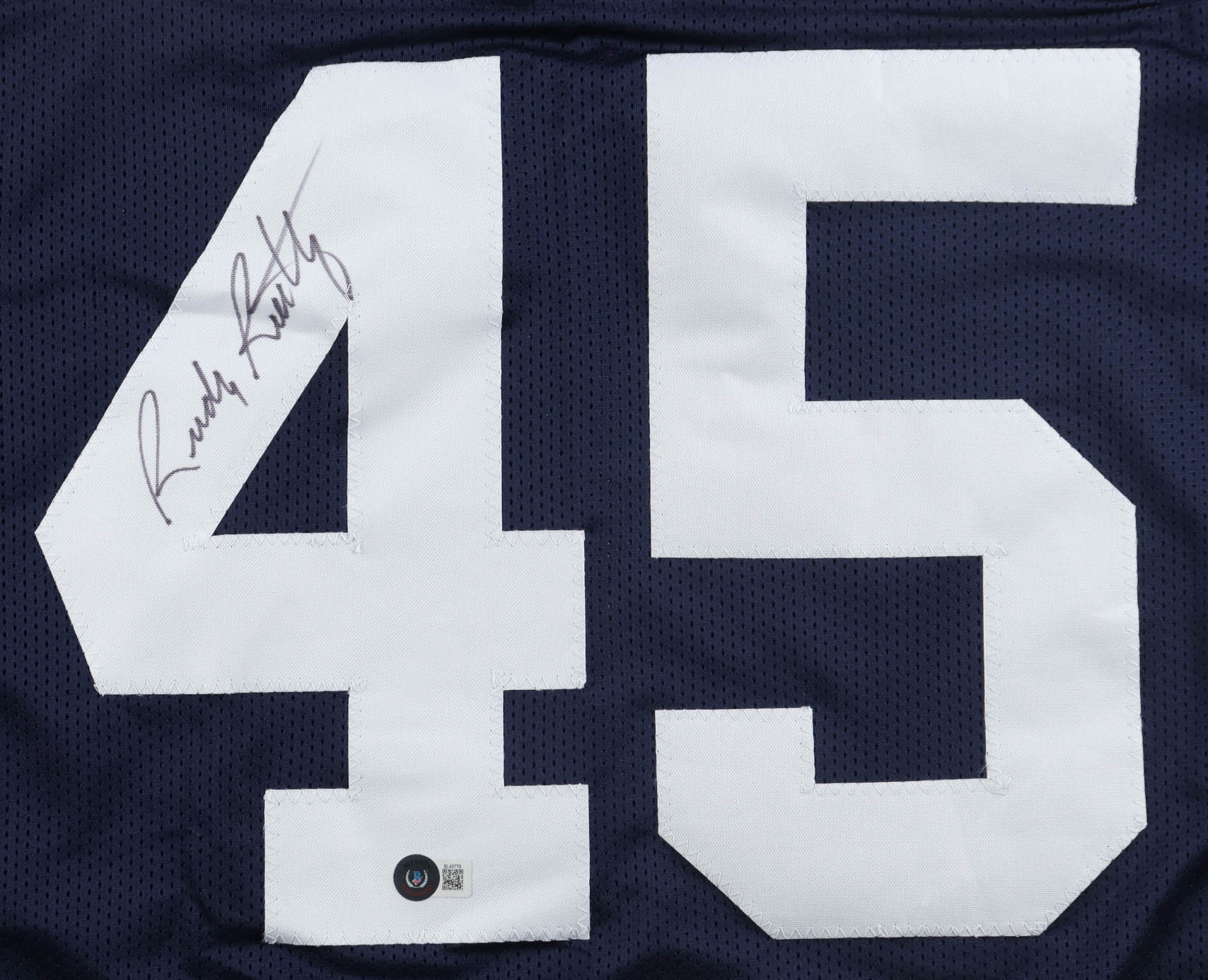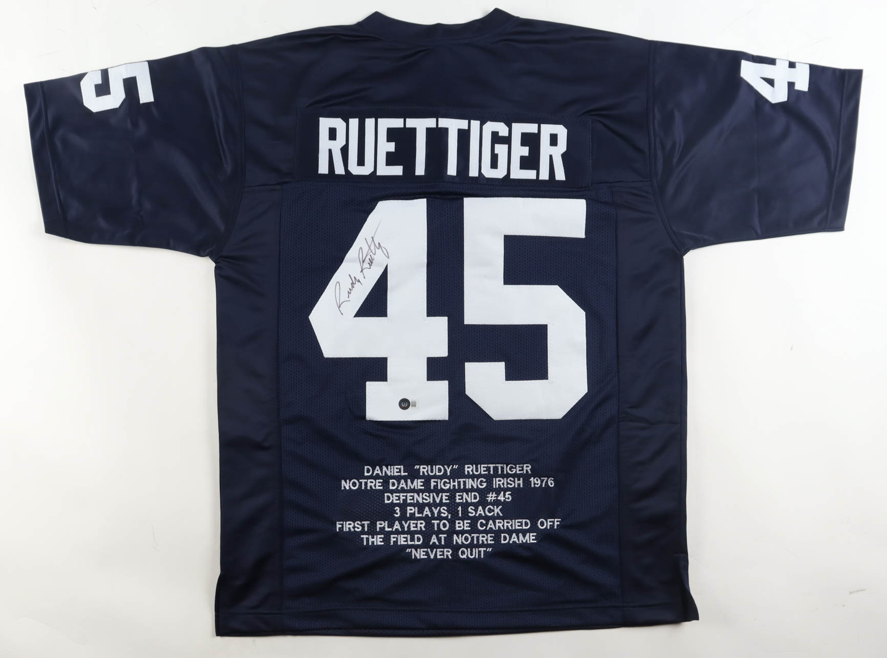 Custom jersey with everything sewn on, size XL. Hand-signed by Rudy Ruettiger. Ruettiger's career highlight statistics have been custom-stitched below the reverse numbers.