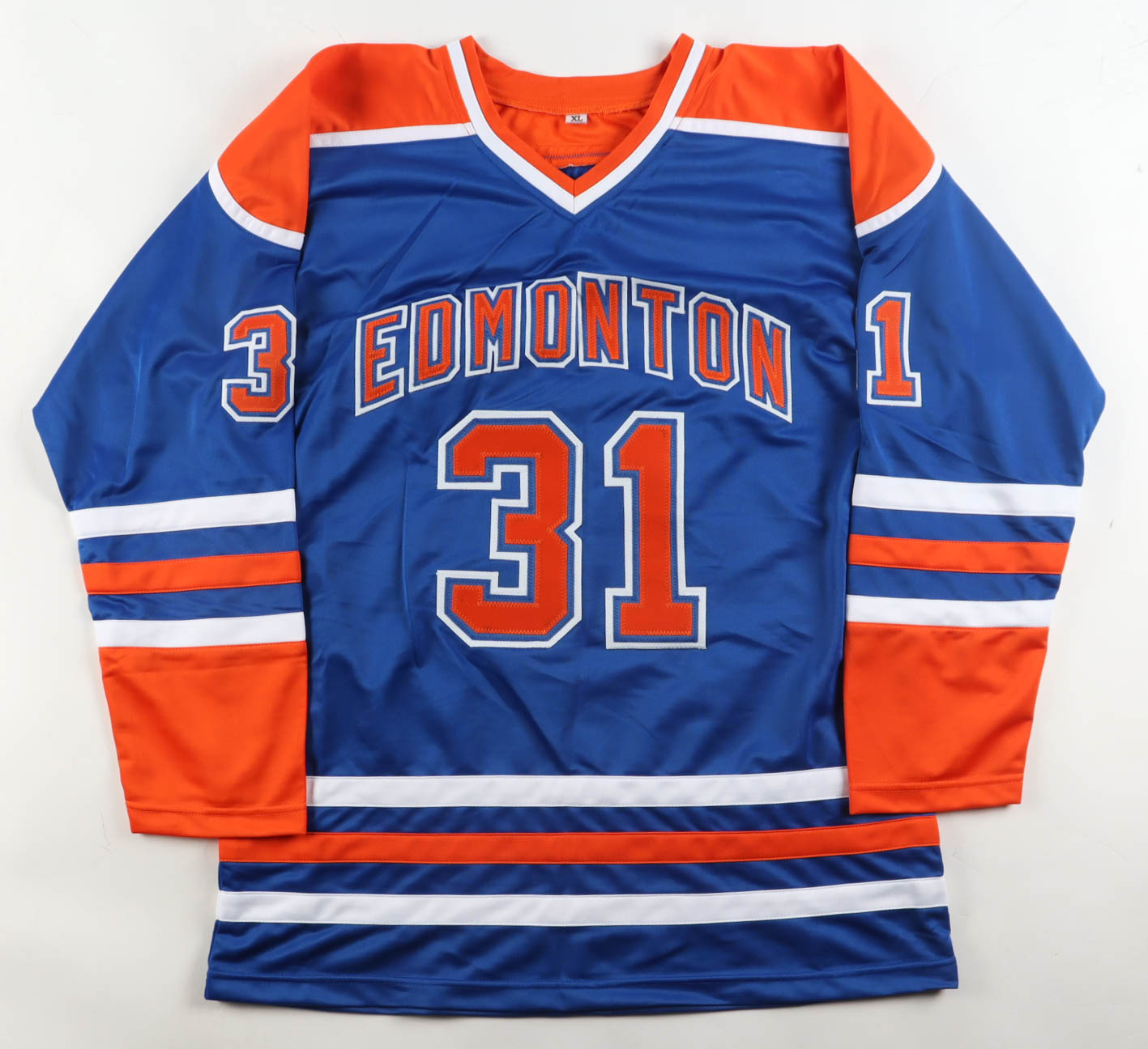 Custom jersey with everything sewn on, size XL. Hand-signed by Grant Fuhr (HOF).