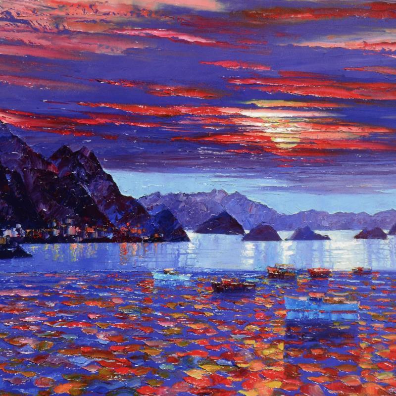 "Amalfi Sunset" is a limited edition texturized giclee on board by Howard Behrens (1933-2014), numbered and bears the artist's official signature. A texturized giclee is a proprietary medium where a mold is made from the original oil painting as a basis for the giclee. Includes Certificate of Authenticity. Measures approx. 36" x 24" (image).