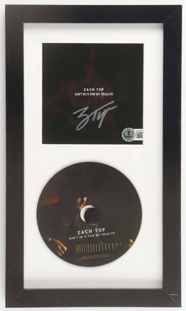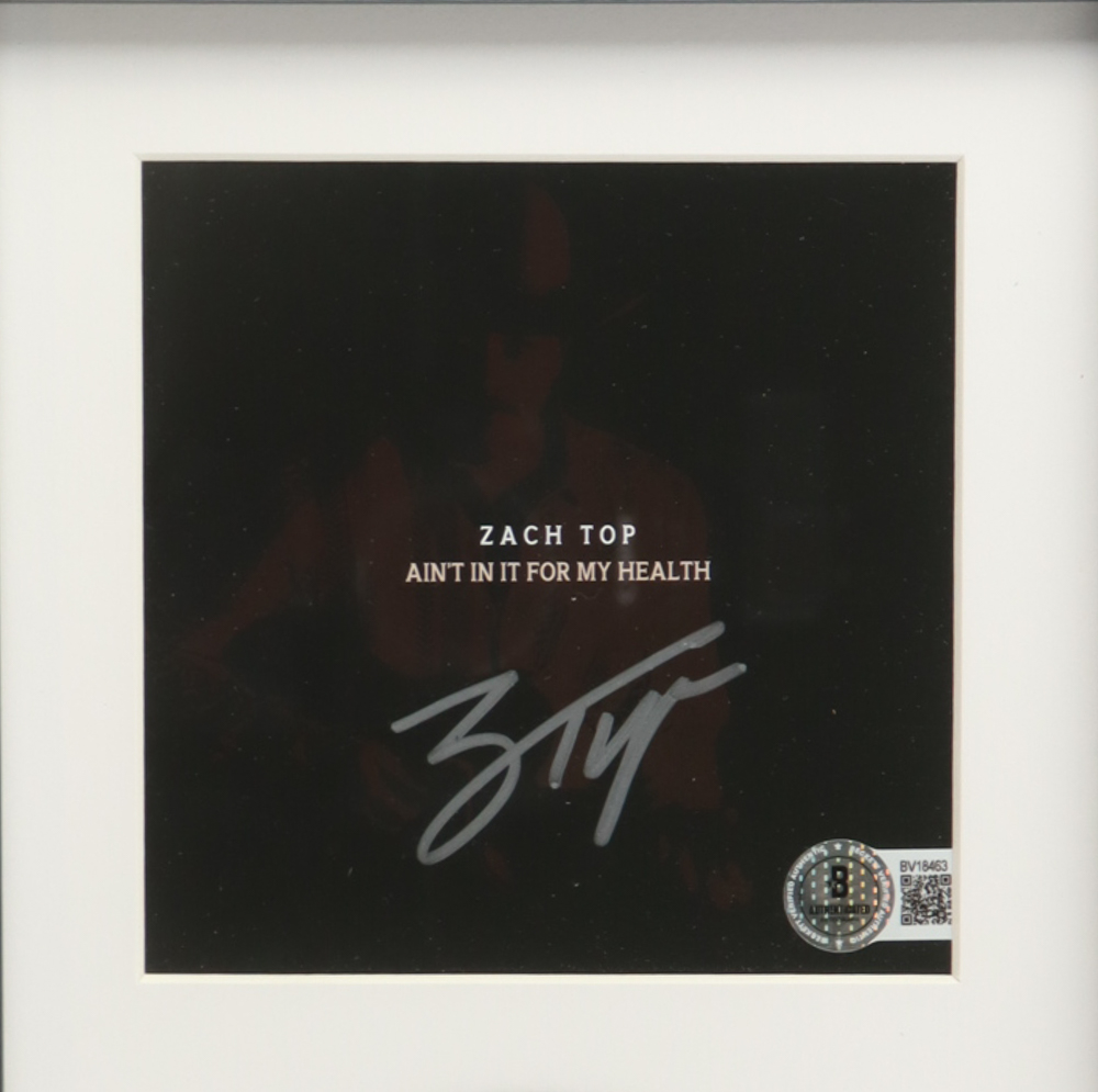Custom frame measures approximately 8" x 13.5" in size. Features a "Ain't in It for My Health" CD insert that has been hand-signed by Zach Top. The display also includes the album insert as shown.