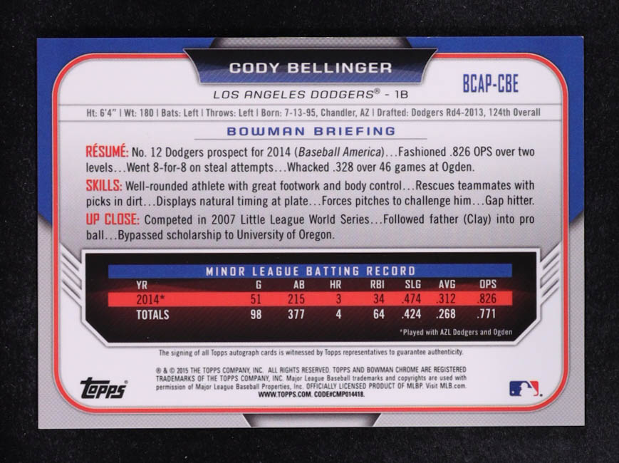 Cody Bellinger 2015 Bowman Chrome Prospect Autograph #BCAPCBE RC