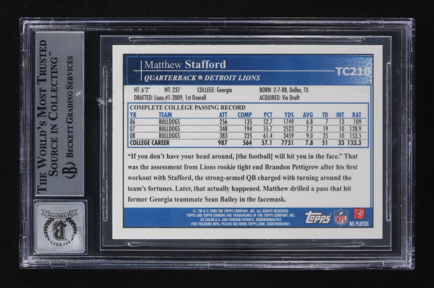 Matthew Stafford Signed 2009 Topps Chrome #TC210 RC Inscribed "2009 #1 Pick" (BGS Encapsulated)