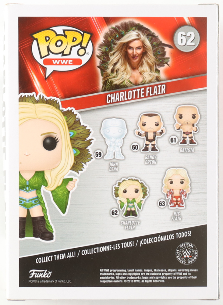 Funko Pop! vinyl figure measures approximately 4" in height and has been hand-signed on the packaging by Charlotte Flair.