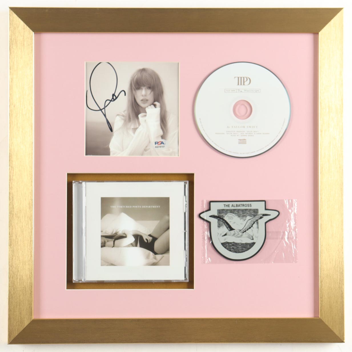 Custom frame measures approximately 16" x 16" in size. Features a "The Tortured Poets Department" CD insert that has been hand-signed by Taylor Swift. CD Case, CD & The Albatross Patch. Please see photos for details regarding the condition of the item.