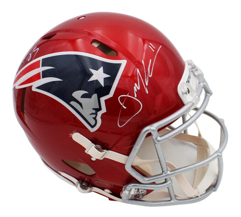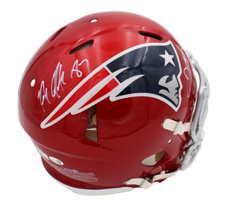 Riddell New England Patriots Full-Size authentic on-field flash alternate speed helmet. Hand-signed by Rob Gronkowski and Julian Edelman.