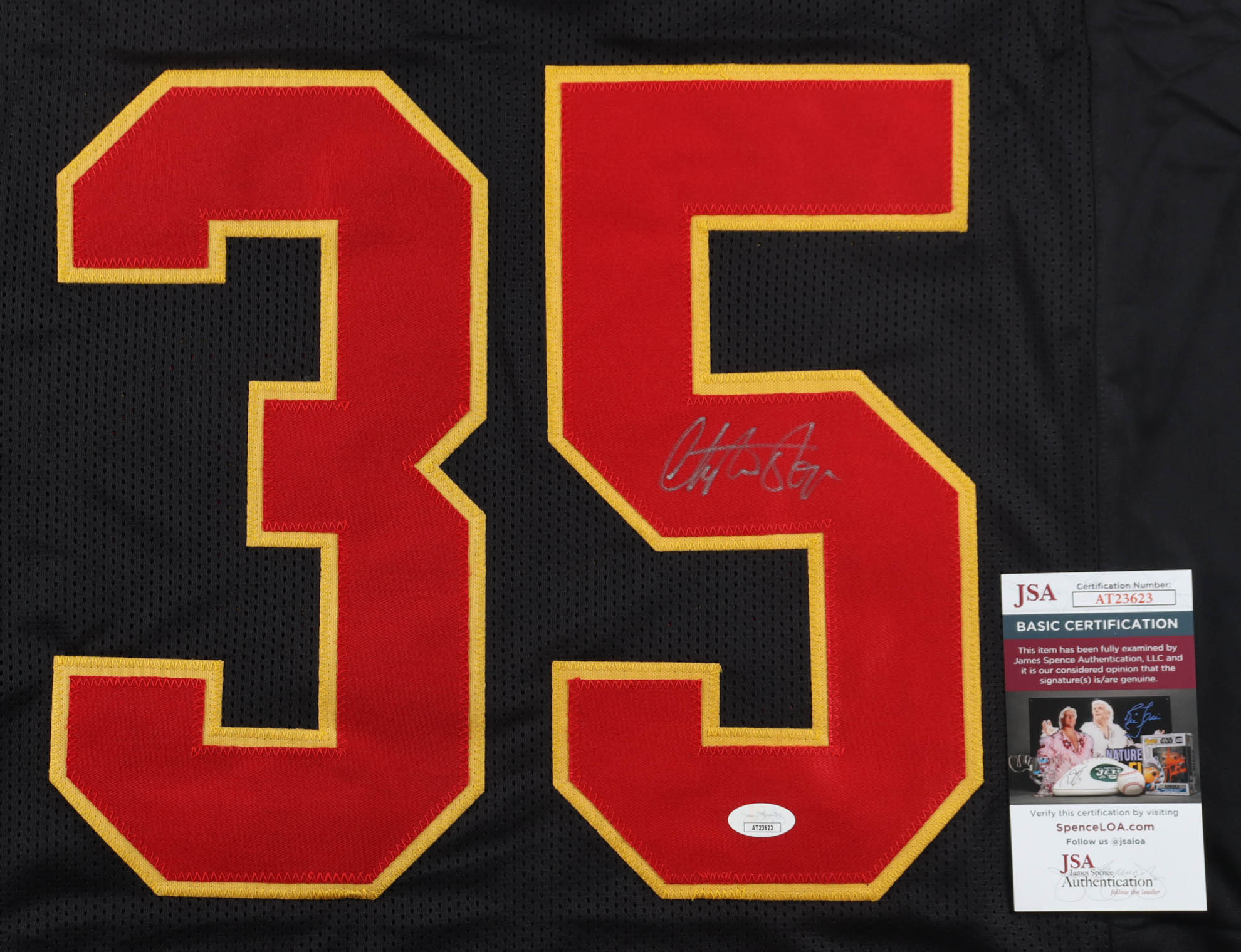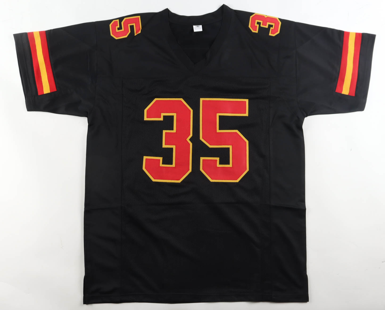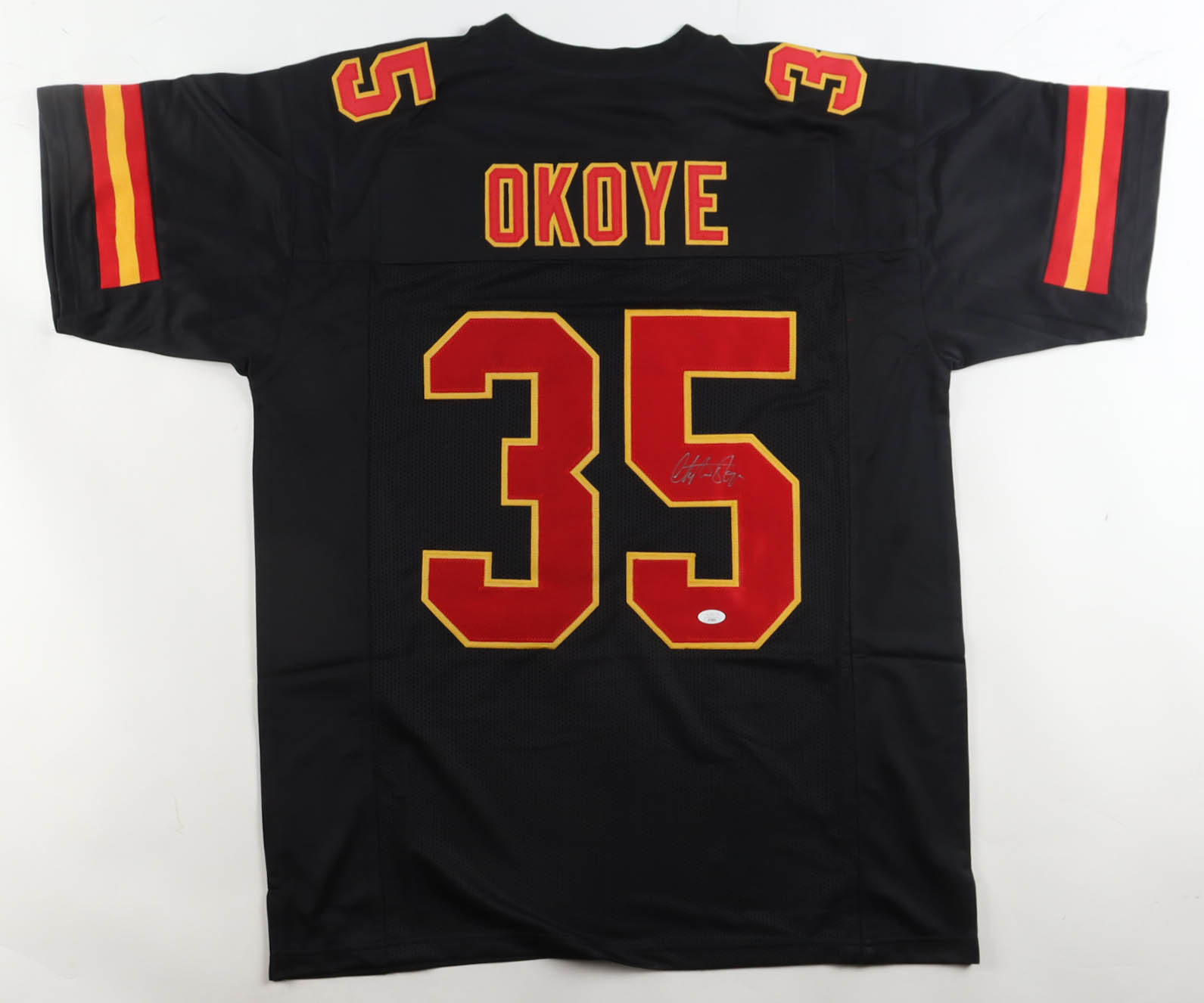 Custom jersey with everything sewn on, size XL. Hand-signed by Christian Okoye.