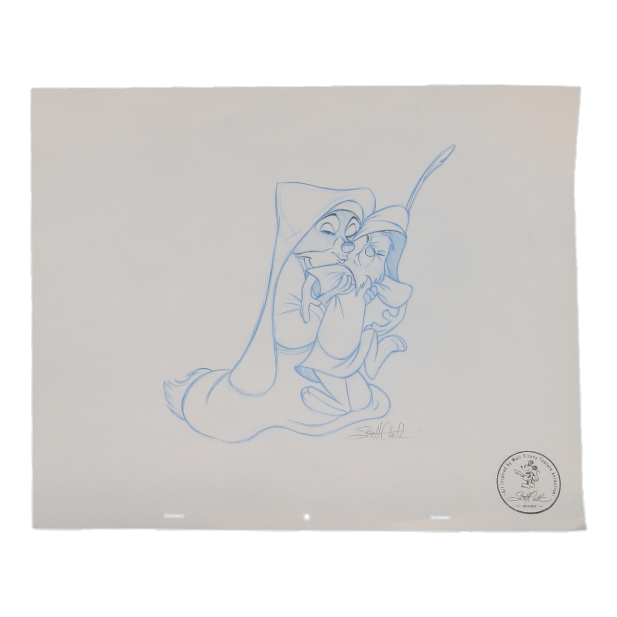 This original sketch colored pencil includes original art which measures 13.5" x 16.5" on 16 field animation paper by award winning Walt Disney artist, Scott Cook. The photo is hand-signed by the artist.