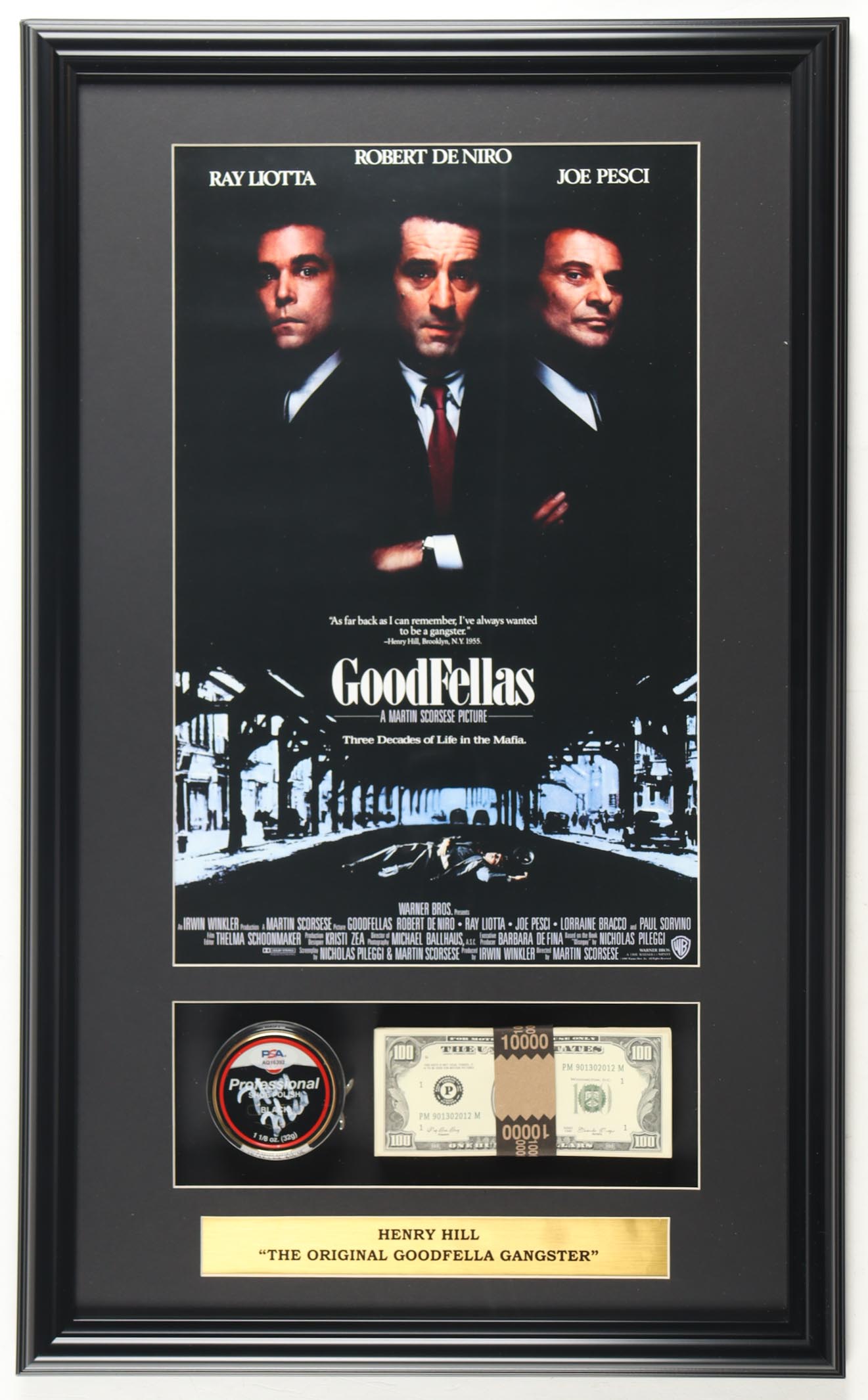 Henry Hill Signed "Goodfellas" Custom Framed Shoe Polish Container Display with Poster Print & Replica Money Stack (PSA)