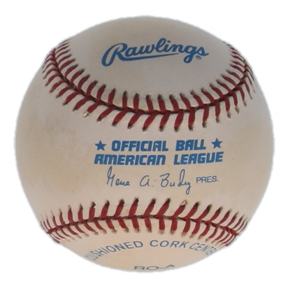 Rawlings Official American League Baseball. Hand-signed by Lee MacPhail (D. 2012, HOF). Please note, the baseball is naturally toning and stained.