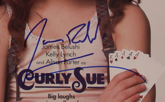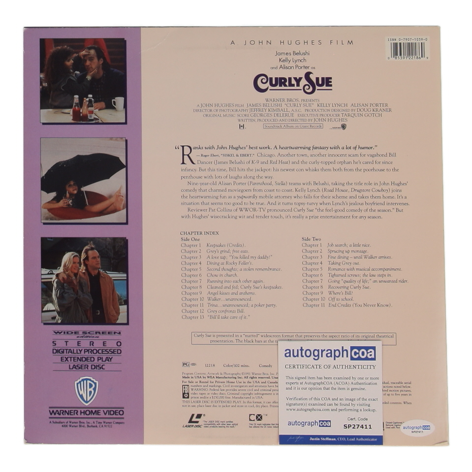 "Curly Sue" A John Hughes film vinyl record soundtrack has been hand-signed by James Belushi. Please note the laser disc is included as shown.