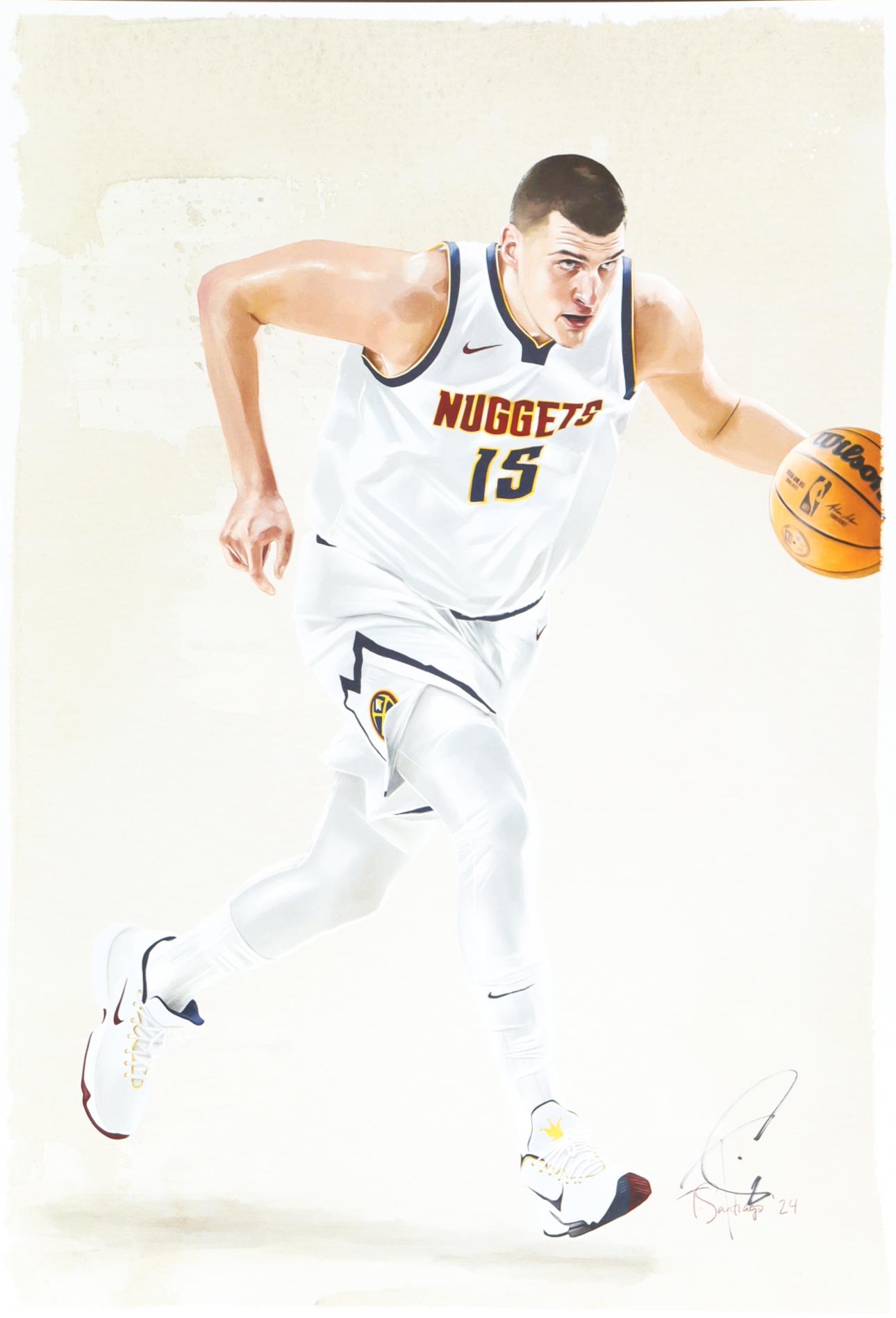 Lithograph on high-quality matte fine art smooth 230gsm paper measures approximately 13" x 19" in size (with border). The piece is hand-signed by renowned artist, Tony Santiago and features Nikola Jokic (Denver Nuggets).