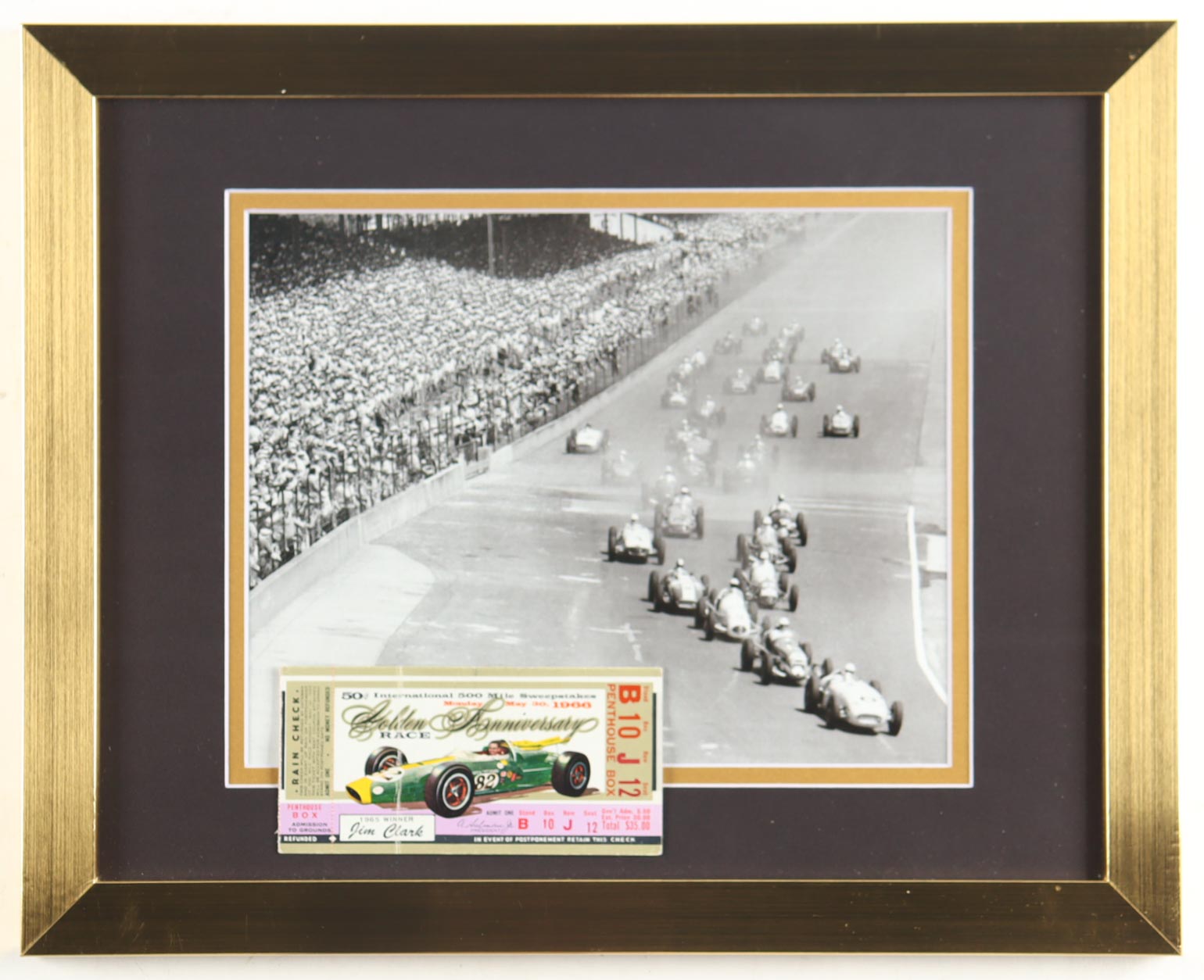 Custom framed display measures approximately 13" x 16" in size. The display includes an 8" x 10" photo as well as an official May 30, 1966 500 Ticket. Please note, the display is unsigned.
