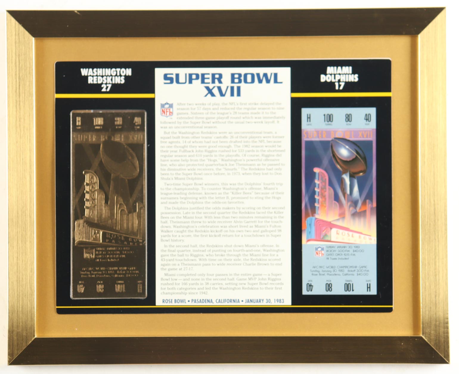 Super Bowl XVII Commemorative Score Card with 23KT Gold Ticket Framed Display