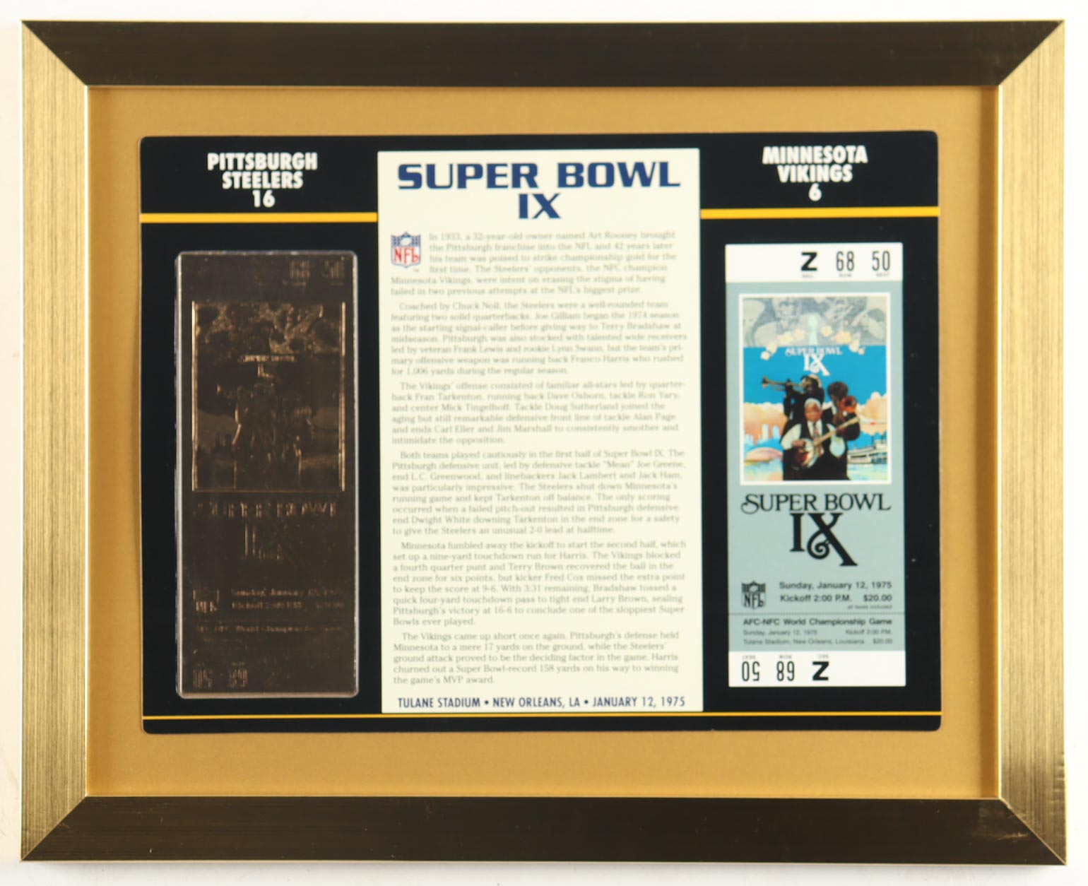 Super Bowl IX Commemorative Score Card with 23KT Gold Ticket Framed Display