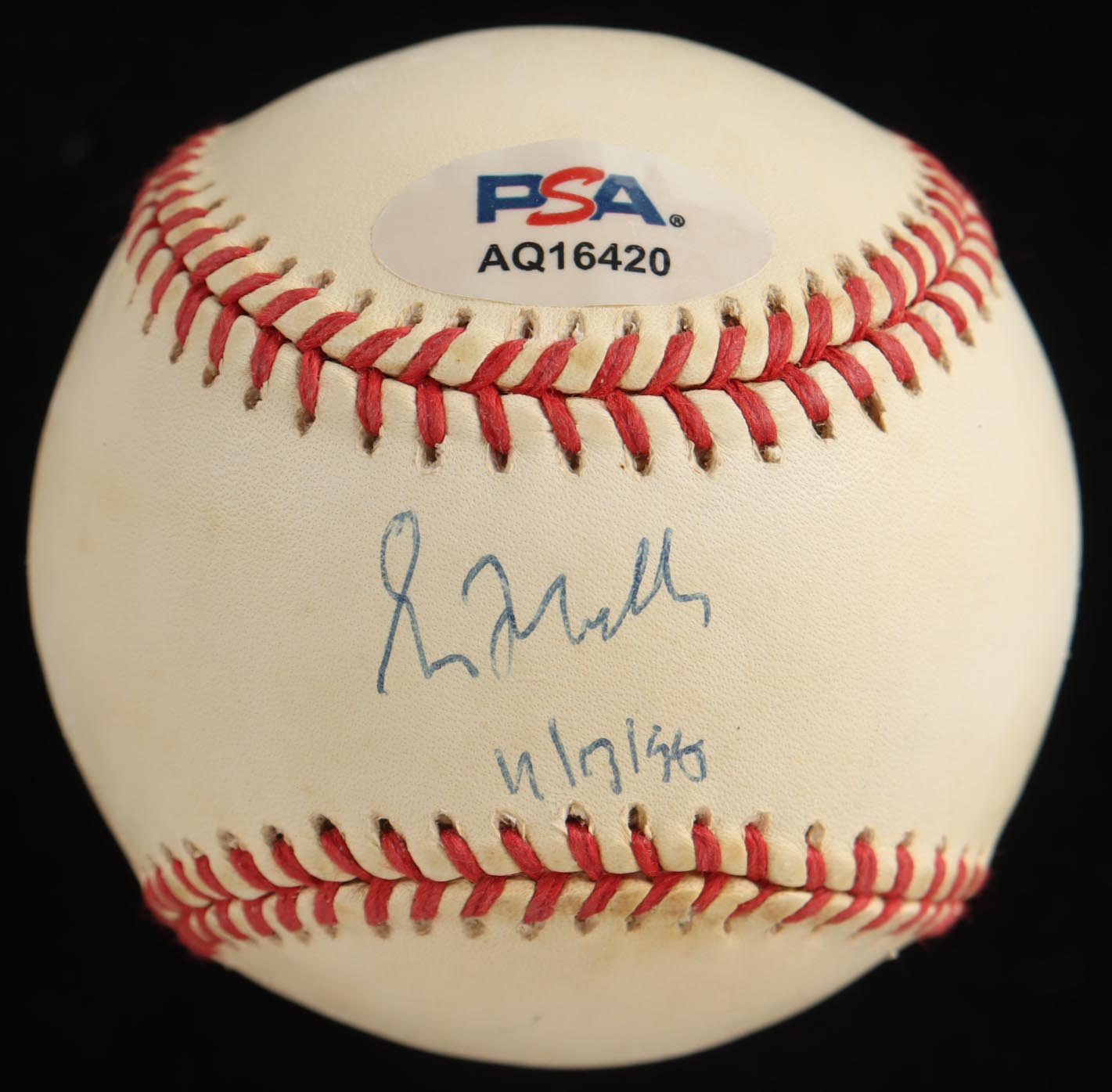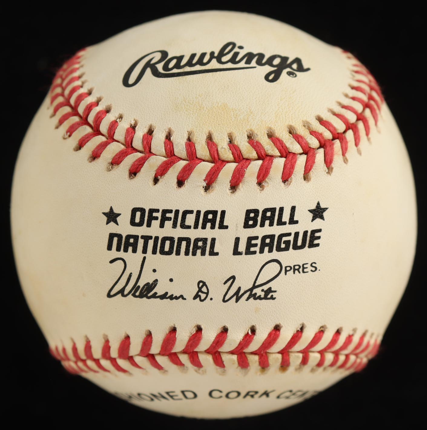Rawlings Official National League baseball has been hand-signed by Greg Maddux (Atlanta Braves). Please note, the baseball is naturally toned and stained.