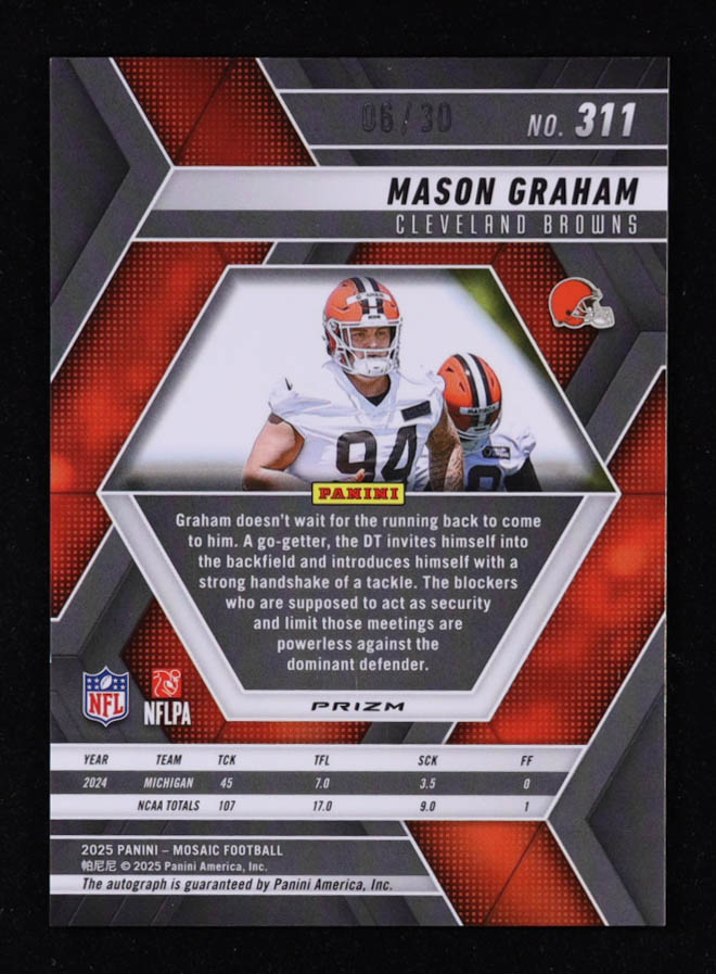 Mason Graham 2025 Panini Mosaic Rookie Autographs Mosaic Green Spectris FOTL #311 #06/30 RC