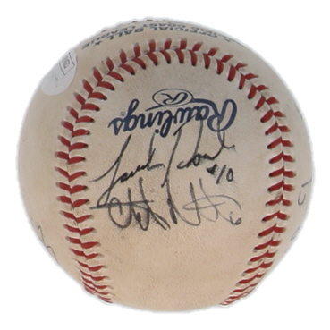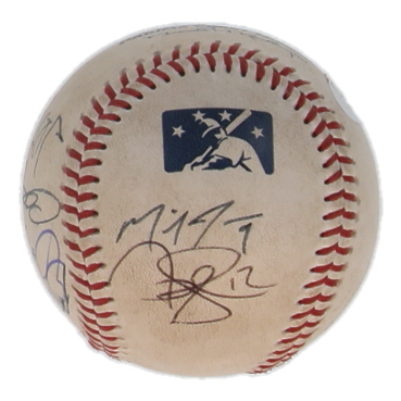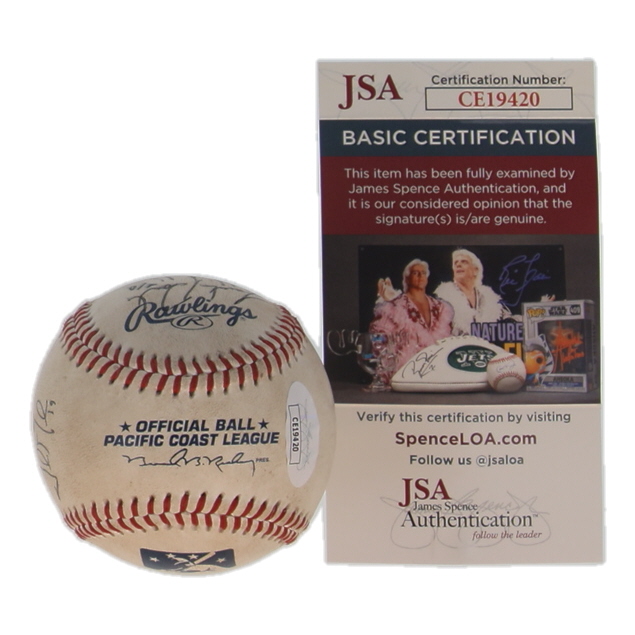 Rawlings Official Pacific Coast League baseball has been hand-signed by Eric Young Jr., Jordan Pacheco, Warren Schaeffer, Josh Muecke, Edgmer Escalona, Mike Jacobs, Jeff Salazar, and Cole Garner.