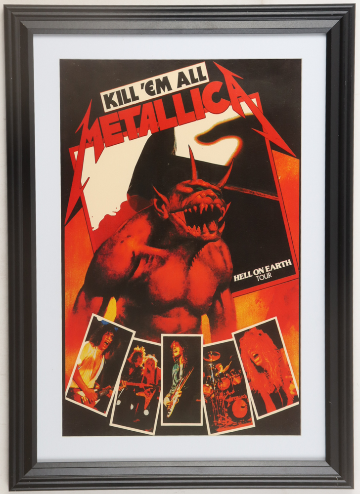 Custom frame measures approximately 15" x 21" in size. The display features a Metallica Hell on Earth 1983 tour poster. Please note frame is unsigned. Refer to photo regarding the condition of the item.