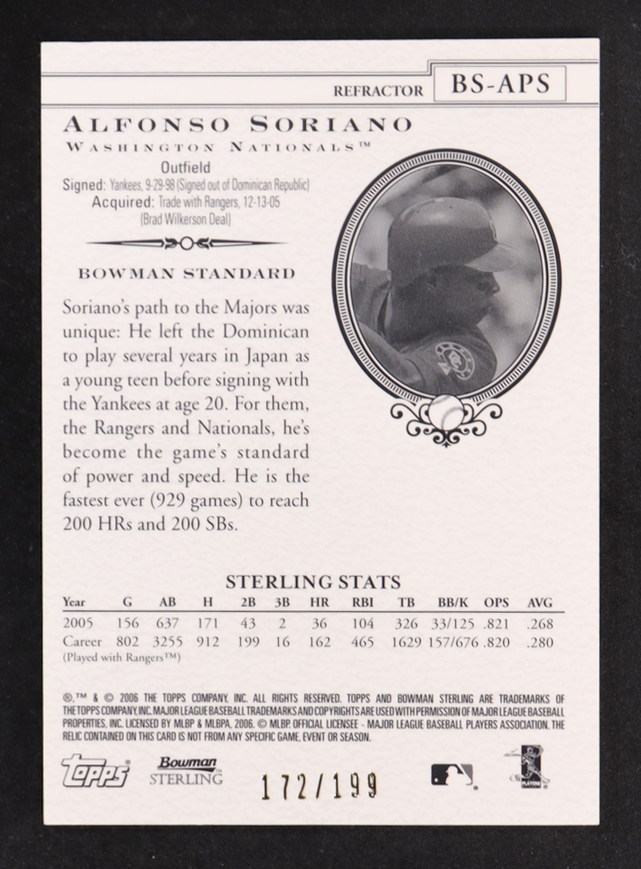 Alfonso Soriano 2006 Bowman Sterling Refractors #BSAPS Bat #172/199
