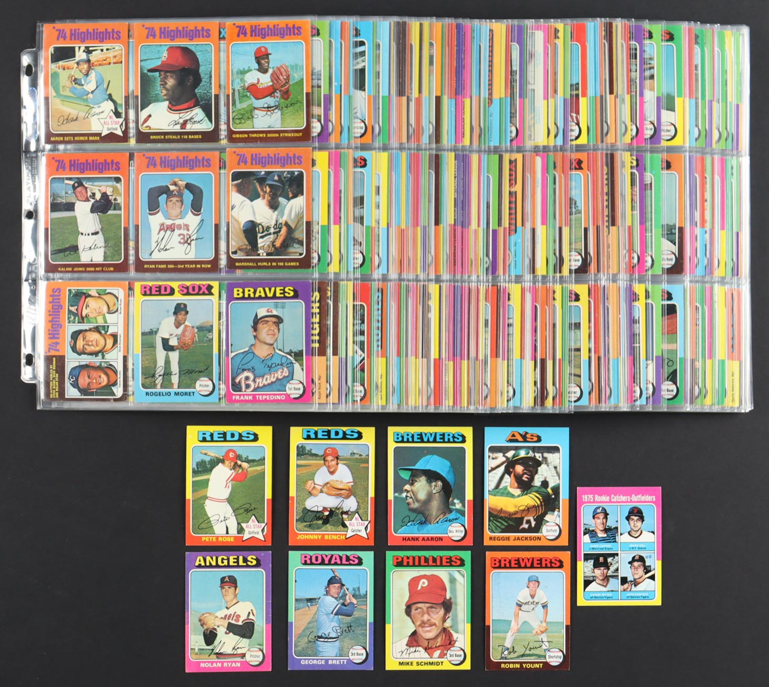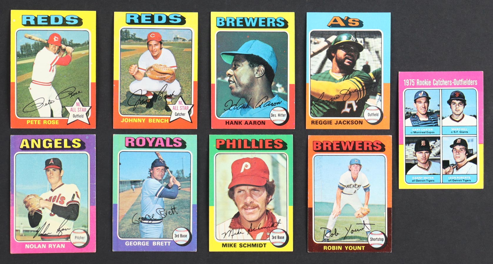 The 1975 Topps Baseball card set is one of the most iconic and colorful releases in the hobby's history, instantly recognizable for its vibrant two-tone borders and bold design. This landmark set features a powerful mix of established stars and legendary rookies, making it a favorite among collectors. Standout cards include veterans like Nolan Ryan, Reggie Jackson, and Pete Rose, all captured in their prime and continuing to build their Hall of Fame legacies. Perhaps most famously, the set introduced the rookie cards of three future Hall of Famers: Gary Carter, Robin Yount, and George Brett, whose careers would go on to define baseball in the late 20th century. With 660 cards in total and packed with talent, the 1975 Topps set remains a cornerstone of vintage baseball card collecting.