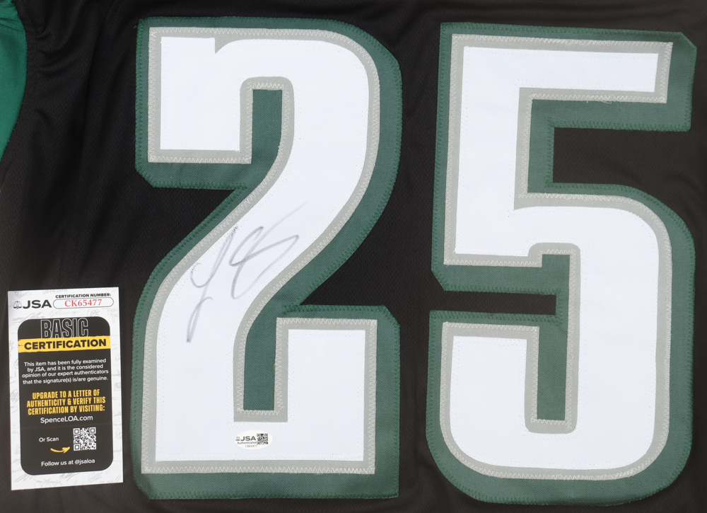 Custom jersey. Everything is sewn on, size XL. Hand-signed by LeSean McCoy. McCoy's career highlights have been custom stitched onto the back of the jersey below the reverse numbers.