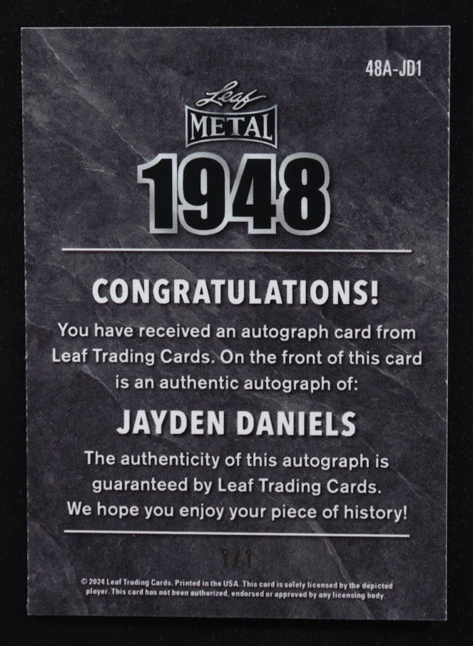 Jayden Daniels 2024 Leaf Metal 1948 Gold Shimmer Auto #48A-JD1 RC #1/1