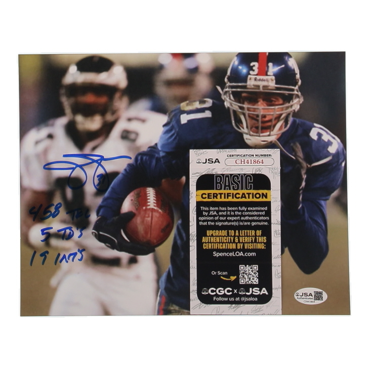 Photograph measures 8" x 10" in size. Hand-signed and inscribed by Jason Sehorn (New York Giants).