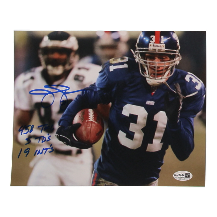 Jason Sehorn Signed Giants 8x10 Photo with Career Stat Inscriptions (JSA)