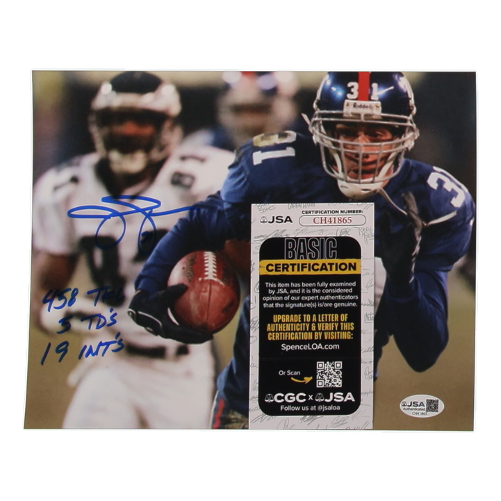 Photograph measures 8" x 10" in size. Hand-signed and inscribed by Jason Sehorn (New York Giants).