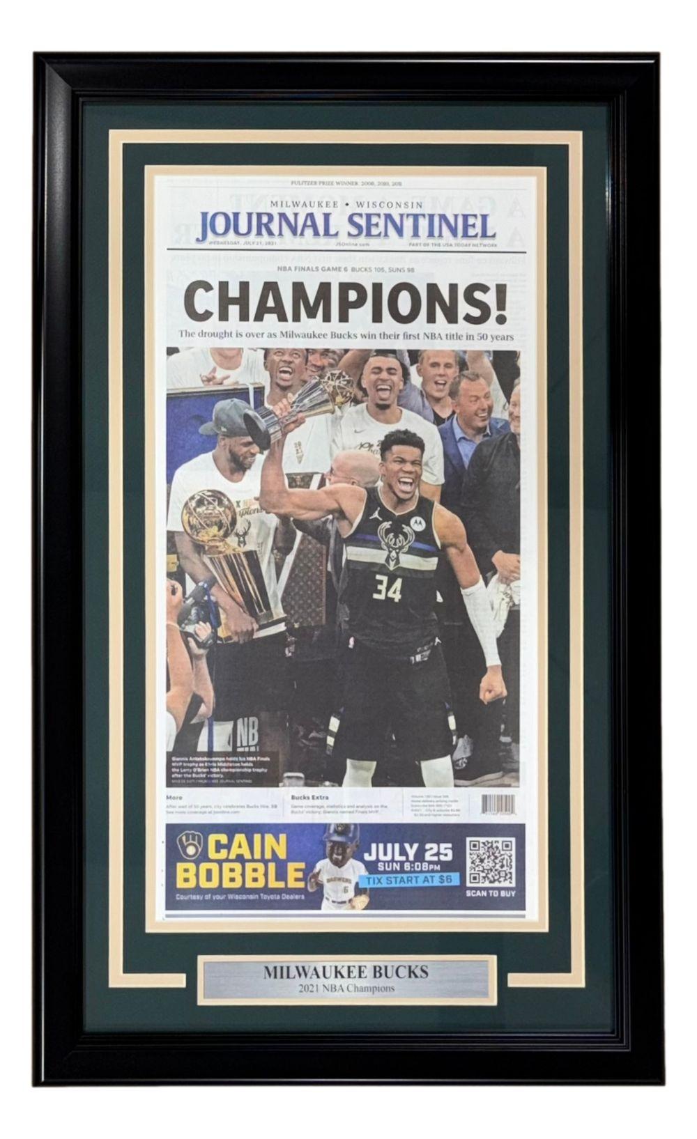 Custom frame measures approximately 21" x 30" in size and features a Milwaukee Journal Sentinel newspaper cover commemorating the Milwaukee Bucks 2021 NBA Championship victory.