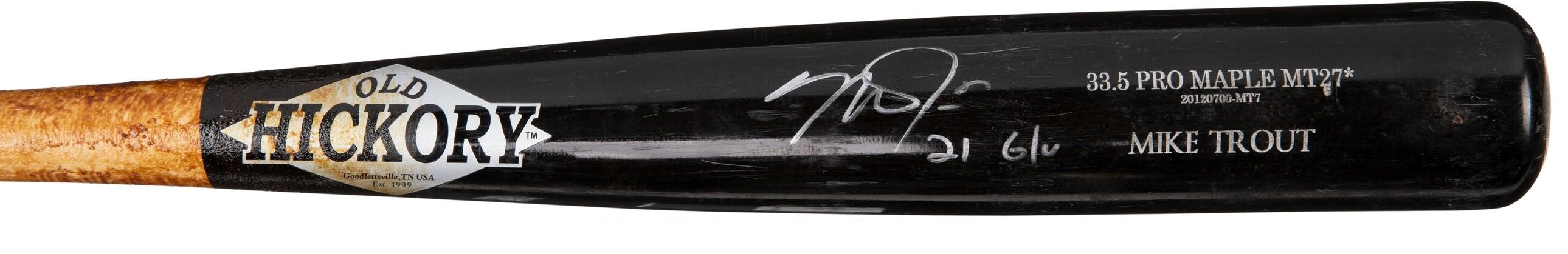 Old Hickory Player Model baseball bat has been game-used, hand-signed, and inscribed by Mike Trout (Los Angeles Angels). Please see photos for more detail regarding the condition of the item.