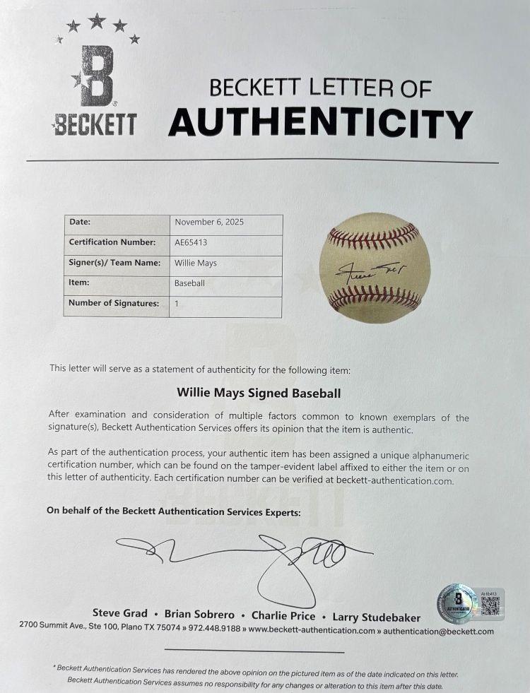 Rawlings Official National League baseball has been hand-signed by Willie Mays (D. 2024, San Fransisco Giants, HOF).