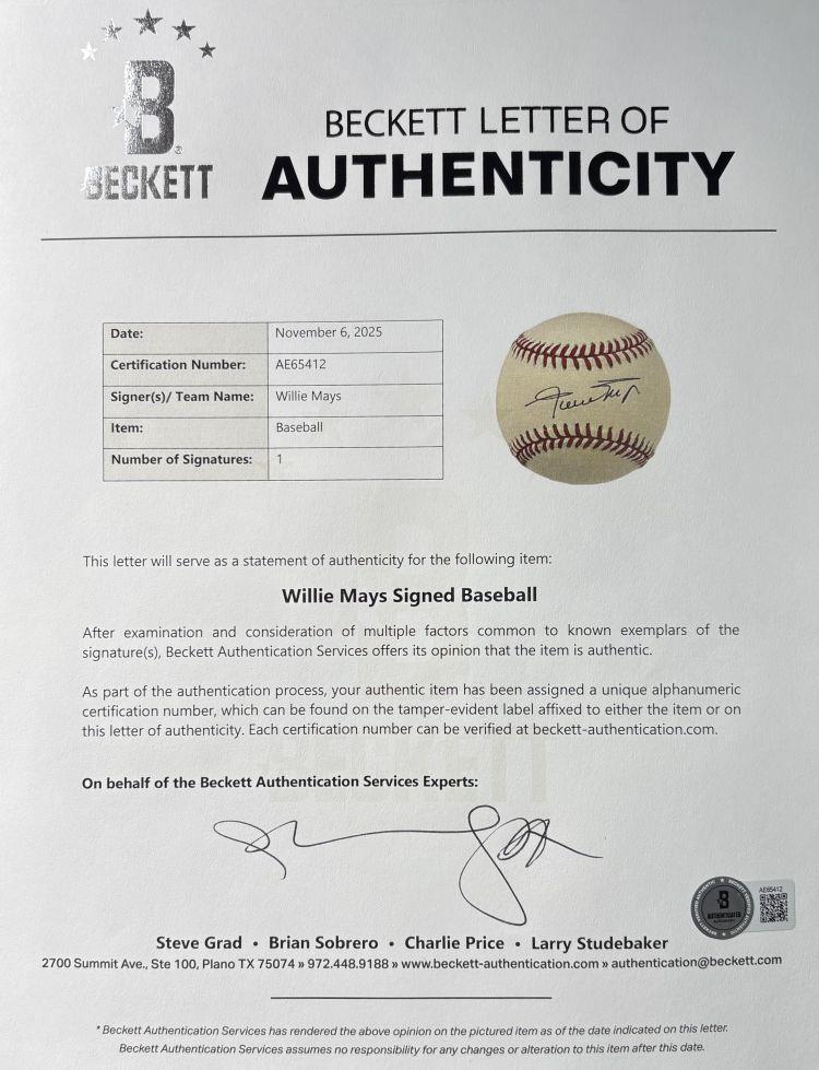 Rawlings Official National League baseball has been hand-signed by Willie Mays (D. 2024, San Fransisco Giants, HOF).