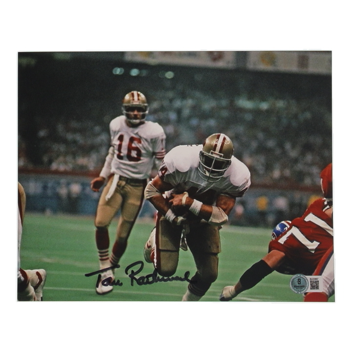 Photo measures 8" x 10" in size and has been hand-signed by Tom Rathman (San Francisco 49ers).