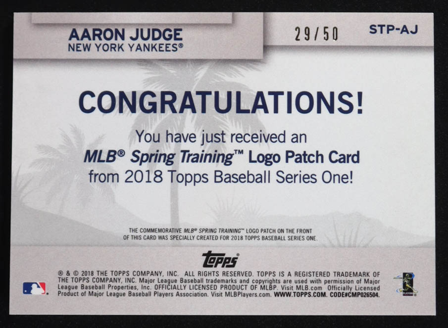 Aaron Judge 2018 Topps Spring Training Logo Patches Gold #STPAJ #29/50