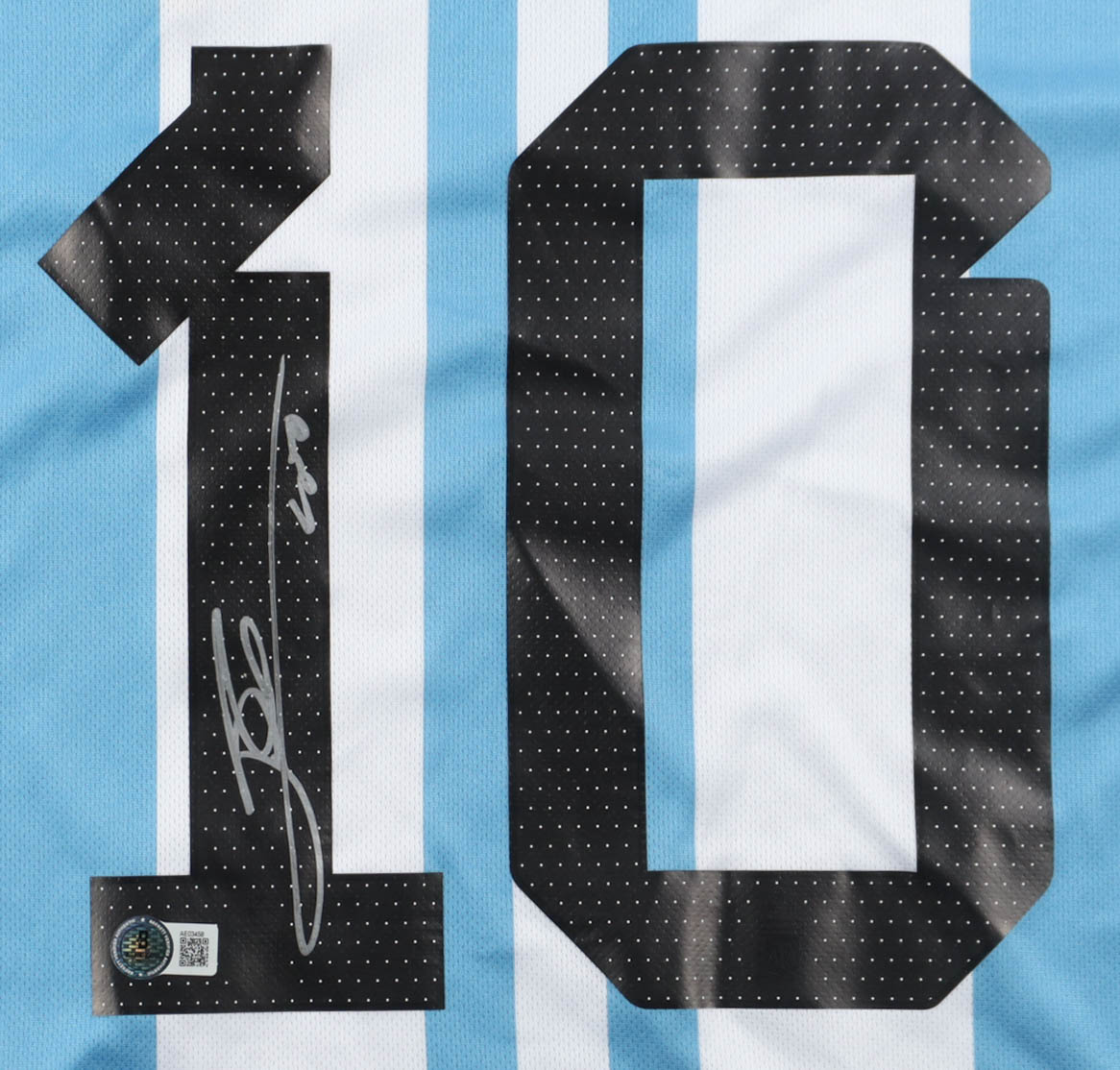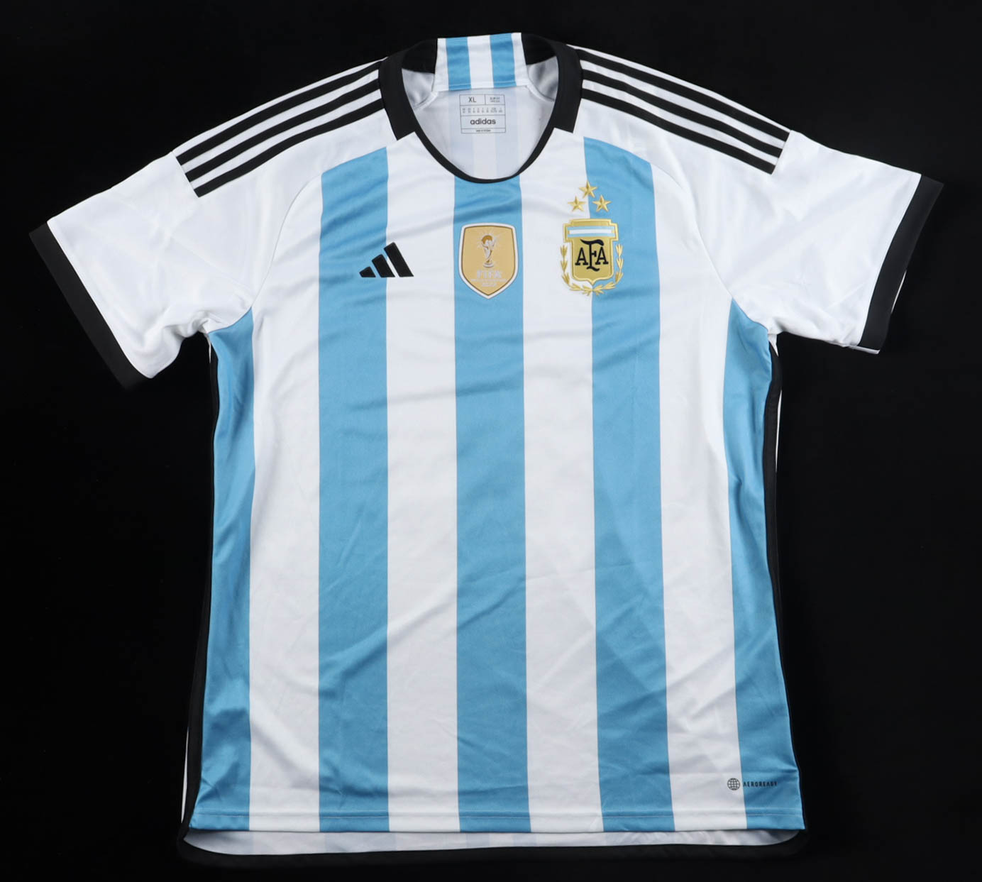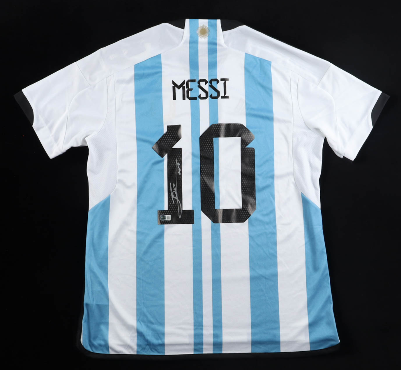 Adidas authentic jersey with everything pressed and sewn on, size XL. Hand-signed and inscribed by Lionel Messi (Argentina National Football Team).