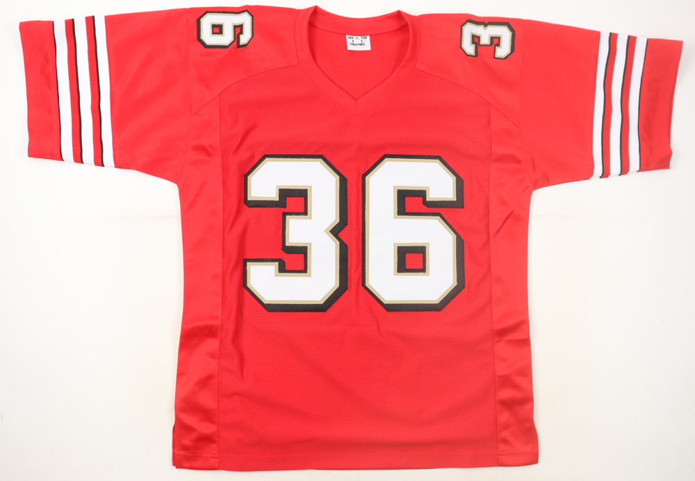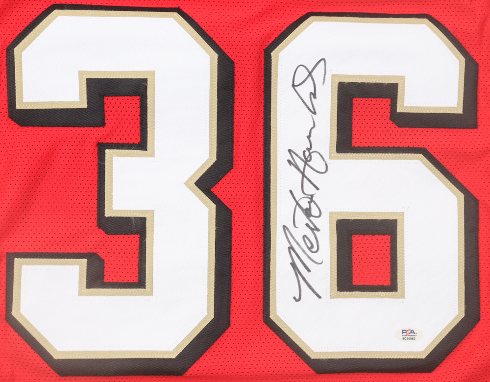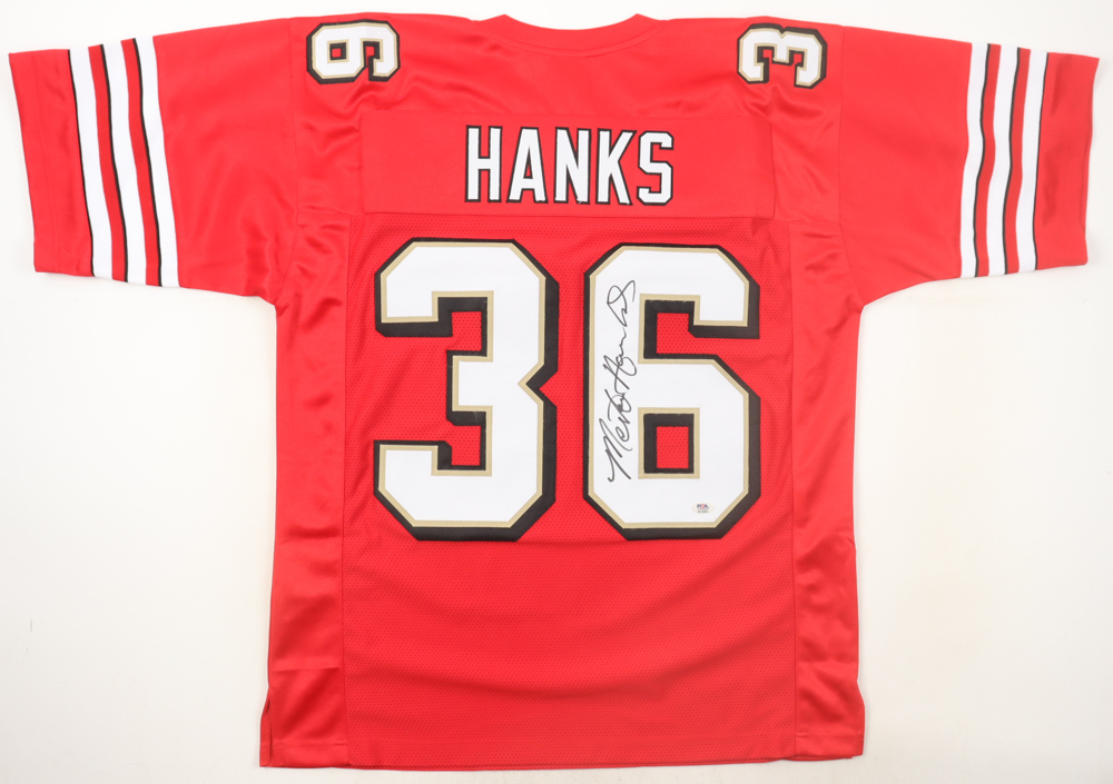 Custom jersey. Everything is sewn on, size XL. Hand-signed by Merton Hanks.