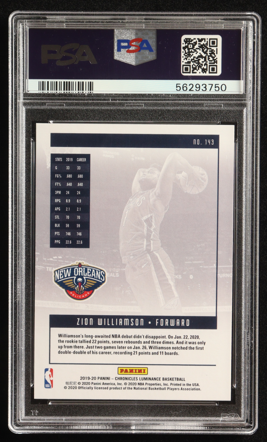 Zion Williamson 2019-20 Panini Chronicles Teal #143 Luminance RC (PSA 10)