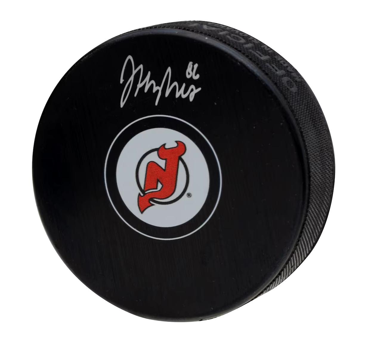 New Jersey Devils logo puck has been hand-signed by Jack Hughes.