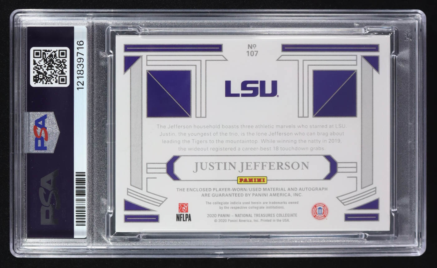 Justin Jefferson 2020 Panini National Treasures Collegiate College Materials Signatures #107 #88/99 RC (PSA Encapsulated)
