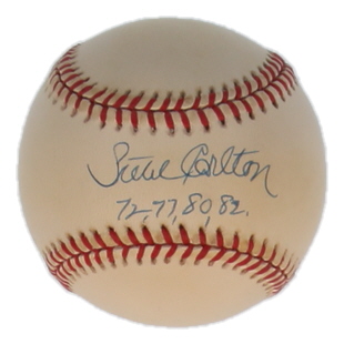 Rawlings Official National League Baseball. Hand-signed by Steve Carlton (Philadelphia Phillies, HOF). Please note, the baseball is naturally toning and stained.