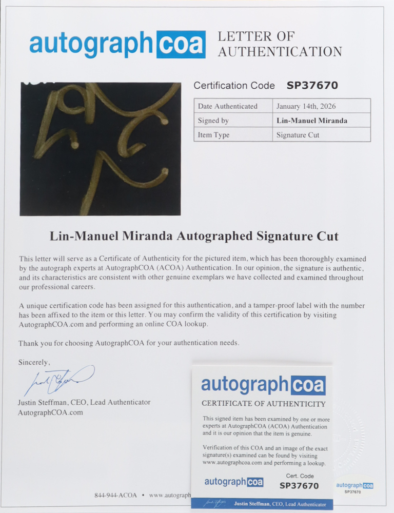 Custom photo display measures approximately 11" x 14" in size and features a cut that has been hand-signed by Lin-Manuel Miranda (Alexander Hamilton).